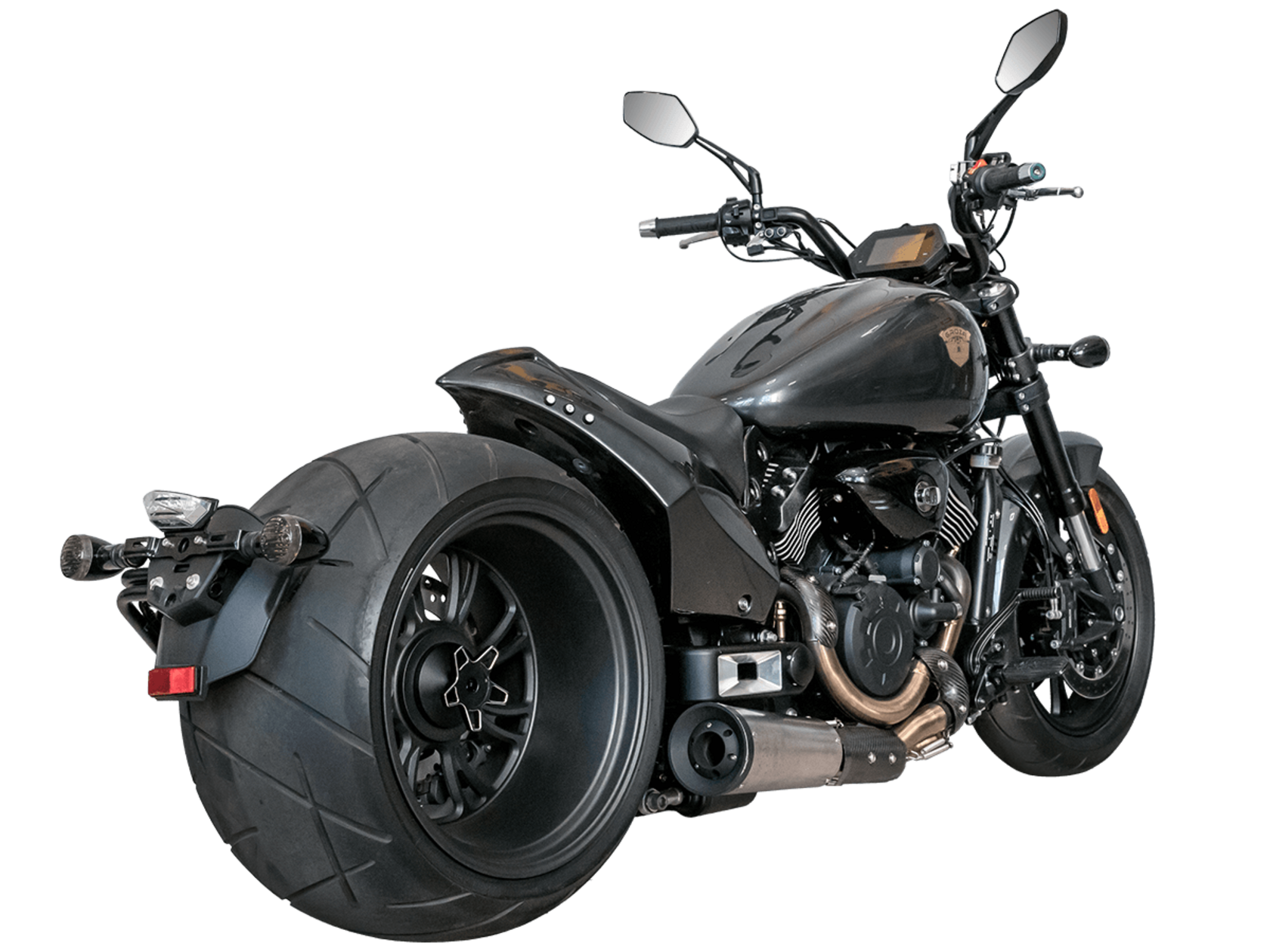 GROZA Wolverine 800 – ультимативный круизёр, который будто бы сошёл со страниц эксклюзивного каталога кастом-байков. Модель названа в честь росомахи – одного из самых свирепых, ловких и бескомпромиссных хищников в животном мире. Пилотируя этот байк, вы не имеете шанса остаться в потоке незамеченным. А в случае, если кто-то на светофоре решит посостязаться в дрэг-рейсинге, 800-кубовый V-твин и гигантская задняя покрышка не оставят преследователям никаких шансов.Двухцилиндровый V-образный четырёхтактный двигатель объёмом 800 см3 мощностью 61 л.с. при высоких показателях динамики и отличном крутящем моменте способен разгонять аппарат до 180 км/ч. Инжекторный впрыск топлива с инжектором DELPHI увеличивает топливную экономичность, а также позволяет добиться высокой приёмистости и неприхотливости агрегата. Привод на ведущее колесо осуществляется ремнём знаменитой марки USA Gates. Жидкостная система охлаждения не допустит перегрева мотора даже при самом агрессивном вождении. Радиатор оснащён фирменными вентиляторами Panasonic, способными обеспечить сильный отвод тепла даже на перегруженных городских дорогах. Металлическая крышка на радиаторе эффективно защищает от ударов твёрдых предметов.Аппарат имеет 6-ступенчатую механическую коробку передач с классической схемой “1-N-2-3-4-5-6”. На мотоцикл установлены литые алюминиевые диски диаметром 17 дюймов спереди и 18 дюймов сзади. Ширина передней покрышки – 140 мм, а задней – рекордные 360 мм! С неровностями дороги эффективно справляются телескопическая вилка перевёрнутого типа спереди и маятник с двумя газонаполненными амортизаторами сзади. Подвеска имеет 7 ступеней регулировки, что обеспечивает лёгкую перестройку на различные режимы езды. Для всего класса круизёров такая опция – большая редкость. Эффективное и безопасное замедление с любых скоростей обеспечивают гидравлические дисковые тормоза спереди и сзади от компании NISSIN. Мотоцикл оснащён ультраминималистичным хвостовым обтекателем и изумительным “ракетным” глушителем с углепластиковыми щитками для защиты ноги, произведённым легендарной фирмой AKRAPOVIC.Wolverine 800 сочетает в себе отличные технические характеристики, богатое оснащение, комфорт и надёжность, что позволяет вам ощутить настоящую свободу на любой дороге.