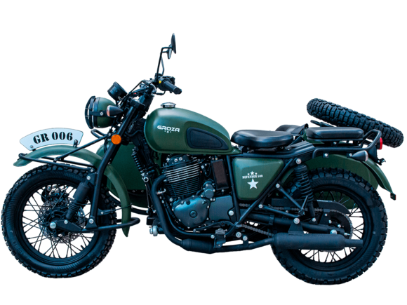 ROZA Defender 500 4T EFI – легендарная модель, представляющая собой сайдкар в стиле ретро-милитари, и напоминающая культовый советский “Урал”. Мотоцикл окрашен в брутальный цвет хаки. Каждый аппарат имеет свой уникальный серийный номер, указанный на олдскульном шильдике, расположенном на переднем крыле.Одноцилиндровый четырёхтактный двигатель воздушно-масляного охлаждения объёмом 445 см3 выдаёт 29 л.с. Инжекторный впрыск топлива с блоком управления BOSCH увеличивает топливную экономичность, а также позволяет добиться высокой приёмистости и неприхотливости агрегата. Привод на ведущее колесо осуществляется цепью.Аппарат имеет 5-ступенчатую механическую коробку передач с реверсом, что существенно облегчает маневрирование в ограниченном пространстве. На мотоцикл установлены классические спицованные колёса диаметром 18 дюймов, обутые в универсальную резину с протектором “ёлочка”, который отлично справляется с ездой по бездорожью. Передняя подвеска редкого типа – маятник с двумя амортизаторами. Сзади установлено два пружинно-гидравлических амортизатора. Эффективное и безопасное замедление с любых скоростей обеспечивают гидравлические дисковые тормоза спереди и сзади с металлокерамическими колодками. Мотоцикл оснащён эргономичным сиденьем с антискользящим покрытием, информативной цифровой приборной панелью, зеркалами заднего вида и яркой галогенной фарой.В задней частим коляски расположен вместительный багажный отсек с двумя газолифтами, а над ним закреплено запасное колесо, которое можно установить взамен любого из трёх колёс мотоцикла – незаменимая вещь для продолжительных путешествий. Также на коляске установлен передний багажник и два боковых кофра. Длительным поездкам также способствует вместительный топливный бак объёмом 13 л. Для безопасности пассажира коляска оснащена ремнём безопасности. Мотоцикл сочетает в себе отличные технические характеристики, комфорт и надёжность, что позволяет вам ощутить настоящую свободу на любой дороге.