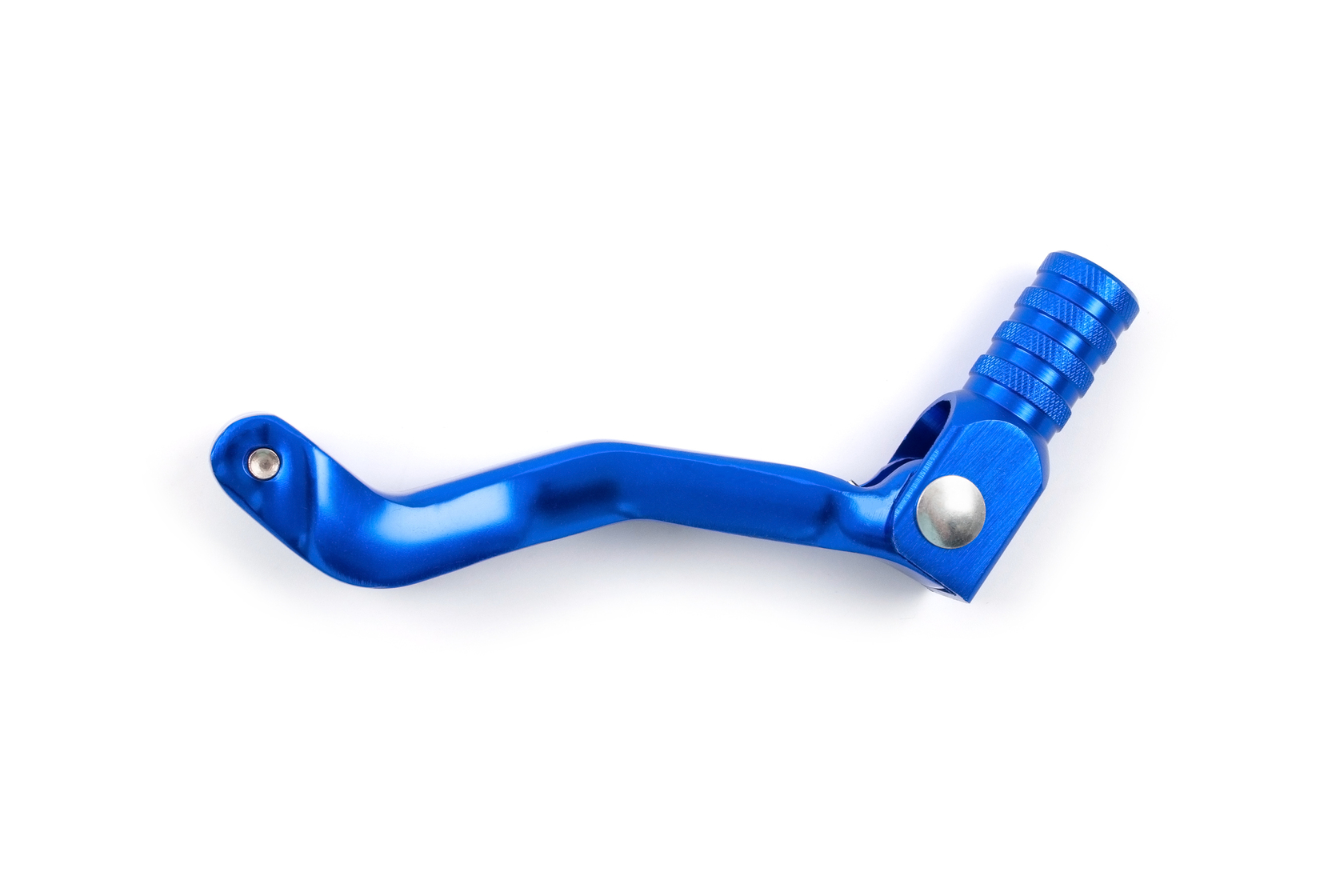 Алюминиевый складной рычаг переключения передач синего цвета для эндуро мотоциклов с двигателями 165-172 FMM и 174 CBS-NB. Изготовлен из литого алюминия со складным кончиком, который предотвращает поломку рычага при падении или боковом ударе. Универсальная конструкция с вылетом, не гнет вал при падениях. Установка без втулки. Совместим с двигателями 165FMM, ZS170MM-2, ZS172-3A, ZS172-5A, ZS174MN-3.