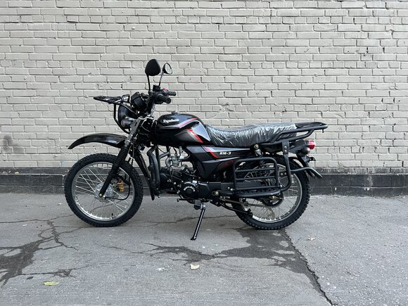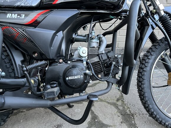 Комплектация Тормозная система – два барабанных тормоза. Усиленные тросы переднего тормоза и сцепления. Кроме того, на Regulmoto Alpha (RM-3) установлены зеркала заднего вида, подножки для пассажира, багажный кофр, пластиковые бардачки, кожух защиты цепи и дуги безопасности.