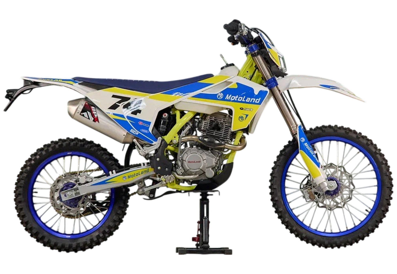MotoLand TT 250 Новинка весны 2020 года. Теперь с ПТС.Надёжная техника из самых популярных компонентов оснащена Двигателем ZONGSHEN 172FMM с кикстартером и электростартером Мощностью 21 Л.С. на двигателе установлен Карбюратор NIBBI PE28.Это полноразмерный кроссовый мотоцикл его база по осям составляет 1430 мм., и габаритами 2180х800х1300 мм. Высота по седлу составляет 950 мм., что по сравнению с Моделью XT 250 ST 21/19 ниже порядка 20 мм. Что позволяет комфортно себя чувствовать райдерам среднего роста.За счет сбалансированной базы мотоцикл имеет отличную управляемость, а конструкция рамы и особенности настройки подвески GPX способствуют максимальному поглощению неровностей дорожного покрытия, а так же усиленная прогрессия на игольчатых подшипниках.Алюминиевые обода c антибуксаторами, усиленными спицами и ступицами CNC. На кроссовой резине Yuanxing 80/100-21 / 100/90-18На мотоцикле установлена обновлённая тормозная система аналог «brembo» с медными колодками , что обеспечивает отличные тормозные характеристики. Особенностью заднего тормоза является, лапка верхнего расположения с эксцентриковой регулировкой.Выпускной патрубок с резонатором Power Bomb имеет крепления на пружинах для снижения вибрации. Глушитель с уникальным дизайном прямоточного типа, полностью алюминиевый для облегчения веса.
