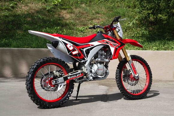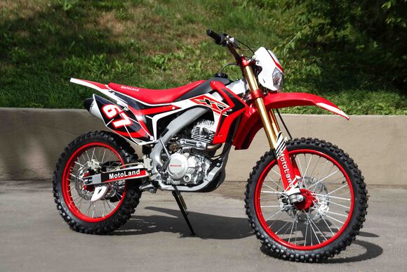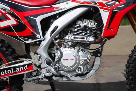 Купить Motoland 250 XR250 в стандартной комплектации будет неплохим решением для всех, кому нужен недорогой кроссовый мотоцикл, подходящий для езды по бездорожью, без выполнения прыжков и базовых трюков. Хорошее качество сборки и доступные цены на комплектующие позволяют поддерживать технику в исправном состоянии без больших затрат при любой интенсивности эксплуатации. Масса мотоцикла составляет порядка 130 кг. Габариты довольно большие – длина составляет 2000 мм., а высота по седлу – 920 мм., ширина руля- 830 мм. поэтому он отлично подойдет для тех, кто имеет рост от 175 см и выше.На мотоцикле установлен обычный для китайских кроссовых мотоциклов двигатель 169 FMM с 17 л.с. мощности, с воздушным охлаждением и рабочим объемом 230 кубов . Диаметр поршня движка составляет 65,5 мм, балансирный вал в конструкции не предусмотрен. Коленвал у мотоцикла Motoland XR 250 имеет палец диаметром 15 мм. Новые партии оснащаются карбюраторами PZ 30 с ускорительным насосом. Для удобства запуска мотора предусмотрен электростартер.Рычаги сцепления и тормоза – обычные, не складные. Передний тормозной диск имеет размер 280 мм., а размер заднего диска составляет 250 мм. Данный мотоцикл комплектуется колесами размерами 18/21 дюймов, размер задней покрышки – 110/90-18, передней- 80/100-21. Установлена 520-я цепь, передняя (ведущая) звезда имеет 13 зубов, задняя (ведомая) – 41 зуб.Подвеска у данной модели имеет стандартную прогрессию, как у большинства «китайцев». Размеры сальников прогрессии – 32х17х4, размеры подшипников – NK 17/16. Передние амортизаторы имеют размеры L=870 d51x55 мм., а задний – 460 мм, регулировки не предусмотрены. Задний маятник мотоцикла тоже стандартный, металлический.У модели Motoland XR 250 руль имеет переменное сечение: в месте установки его размер составляет 28 мм, а на концах под грипсами – 22 мм. Перевернутая вилка позволяет легче преодолевать любые неровности на дороге даже новичкам.Мотоцикл оснащен фарой головного света, что является необходимым условием для езды в сумерках и темноте. Если он покажется вам недостаточно ярким, вместо стандартной лампы можно установить LED освещение или Биксенон. Переключение света осуществляется ключом зажигания.