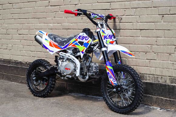 Питбайк KAYO Mini К125EM 14/12 – идеальный снаряд для юных экстремалов, который можно использовать на лёгких кроссовых трассах и дорогах с различным покрытием. Подходит для детей от 10 лет, желающих освоить технику езды на внедорожном мотоцикле. Удобный, простой и надёжный мотоцикл, который полностью оправдывает свою цену.Одноцилиндровый 4-тактный двигатель воздушного охлаждения производства KAYO объёмом 125 см3, выдаёт 9 л.с. Карбюратор NIBBI PE19 обеспечивает бесперебойную работу техники в самых жёстких условиях эксплуатации, простоту и лёгкость в обслуживании, а также неприхотливость к качеству топлива. Питбайк оснащён механической 4-ступенчатой коробкой передач с формулой “N-1-2-3-4”.Аппарат имеет вес всего 70 кг. Усиленная рама из хром-молибденового сплава и подвеска позволяют эффективно амортизировать удары при езде по неровностям и препятствиям на трассе. Передняя подвеска —телескопическая вилка длиной 625 мм, задняя —моноамортизатор 280 мм. Рама и пластик разработаны фирмой KAYO. Мотоцикл оснащён классическими стальными спицованными колёсами диаметром 14 дюймов спереди и 12 дюймов сзади. Эффективное и безопасное замедление с любых скоростей обеспечивают гидравлические дисковые тормоза марки HSK.Высококачественная износостойкая резина с развитым протектором отлично держит дорогу на различных типах покрытия. Аппарат оснащён системой запуска двигателя при помощи кнопки электростартера или при помощи рычага кик-стартера.Если вы ищете послушный, компактный, шустрый, красивый питбайк для своего малыша, считайте, что вы его нашли. Это один из лучших мотоциклов для обучения и первых шагов в эндуро и мотокроссе. Он отлично подойдёт как для гонок на трассе, так и для покатушек по пересечённой местности.