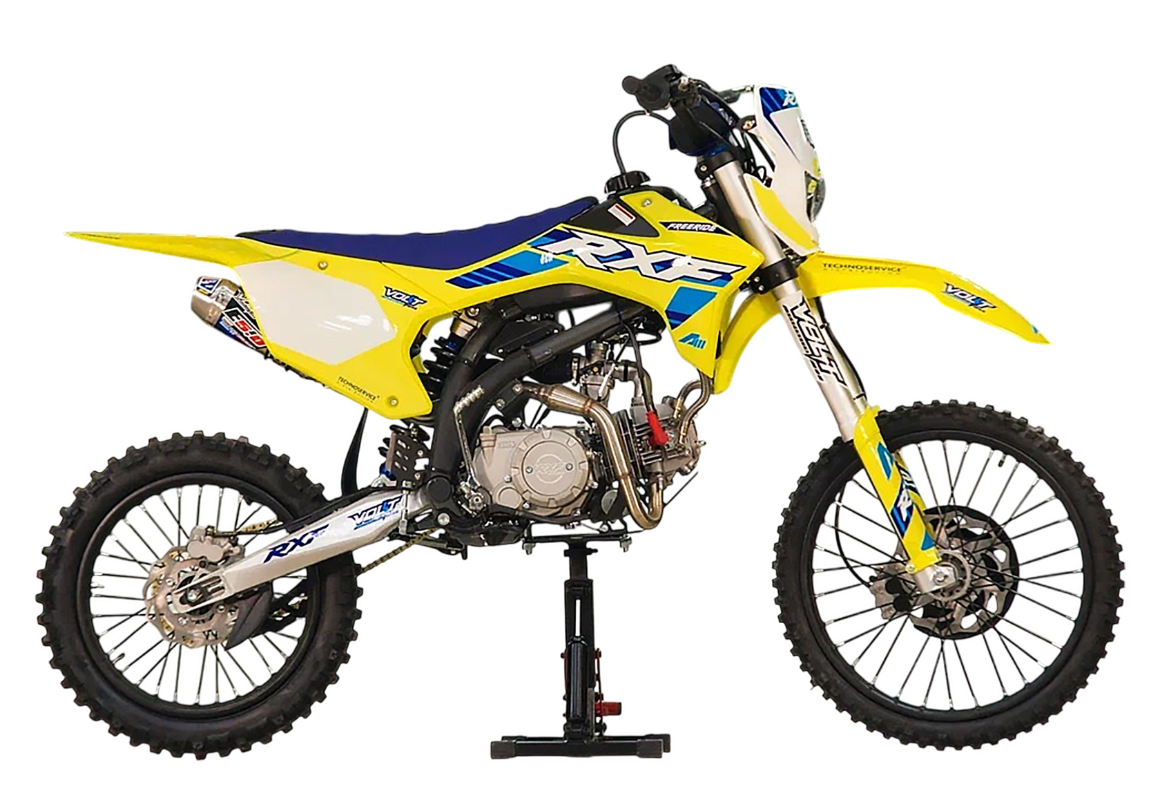 Питбайки компании Apollo родом из Франции. Головной офис компании расположен в Париже. Идеология, заложенная в бренд, носит спортивный характер. Улучшение “породы” происходит в гонках.Модели Apollo RXF (17/14) безошибочно узнаваемы благодаря хребтовой раме с V образным профилем боковой проекции начинающейся от точки крепления маятника под углом 45 градусов. Геометрия рамы была переработана и полностью учитывает размерность применяемых колес, а расстояние от подножек до седла одно из самых больших, что в свою очередь благотворно влияет на езду в стойке.Подвески питов оснащаются вилками и амортизаторами volt, топовые модели имеют регулировки по отбою. На всех моделях установлены двигатели YX, с объемами: 125, 140 и 150 см3 (последний с разными типами ГБЦ) Так же в модельном ряде появился самый кубатурный мотор ZongSheng 190 см3, оснащенный 5 ступенчатой КПП и электростартером.Хочется отметить, что компания Apollo в линейки RXF, закончило полноценную интеграцию и оптимизацию моделей под “большие колеса”. Это можно заметить при взгляде на питбайки в боковой проекции. Расстояние между баком и рулевой колонкой потеряло “зазор”, причина которого крылась в наращивание переднего треугольника под 17 колесо. Сейчас это пространство полноценно поглотил бак, который в свою очередь увеличил объем с 4,7 литров до внушительных 6,5 л. Полностью новый пластик оптимизирован под пропорции “выросшего питбайка”, сиденье стало тоньше и изящнее, боковые щитки увеличены в размерах, глубокий разрез по боковой линии подчеркивает раму, удлиненное заднее крыло и полностью новое передние, не оставляют шансов грязи. Тормозные диски получили пластиковую защиту, амортизатор брызговик, а карбюратор фильтрбокс. Продуманность компоновки питбайка выгодно отличает данную марку от других брендов.Проделанная работа позволила вернуть визуальную целостность модели, которой обладала вся серия Apollo на колесах 14/12.