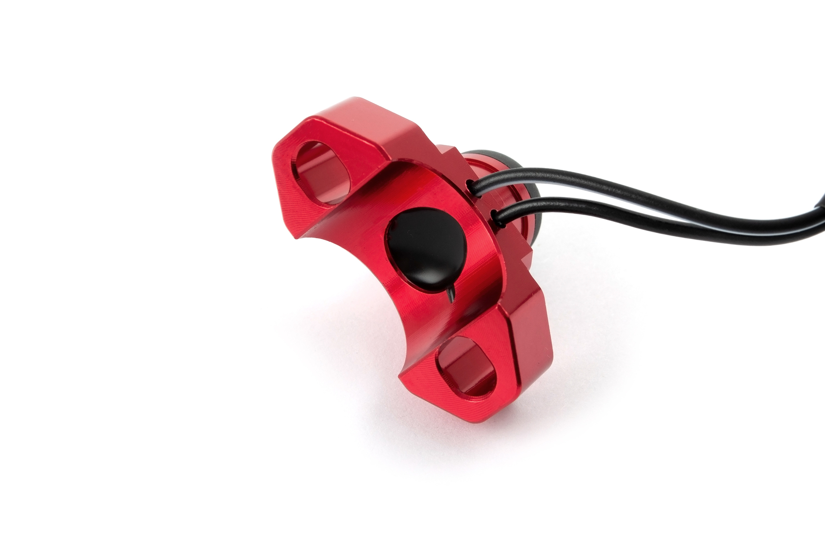 Универсальная кнопка запуска и остановки двигателя OTOM красного цвета. Выполняет функции включения или выключения двигателя в зависимости от схемы подключения. Корпус изготовлен из CNC алюминия, обеспечивает надежную влагозащиту. Стандартное крепление двумя болтами вместо штатного рычага сцепления или тормозной машинки. Подходит для установки как с левой, так и с правой стороны руля.